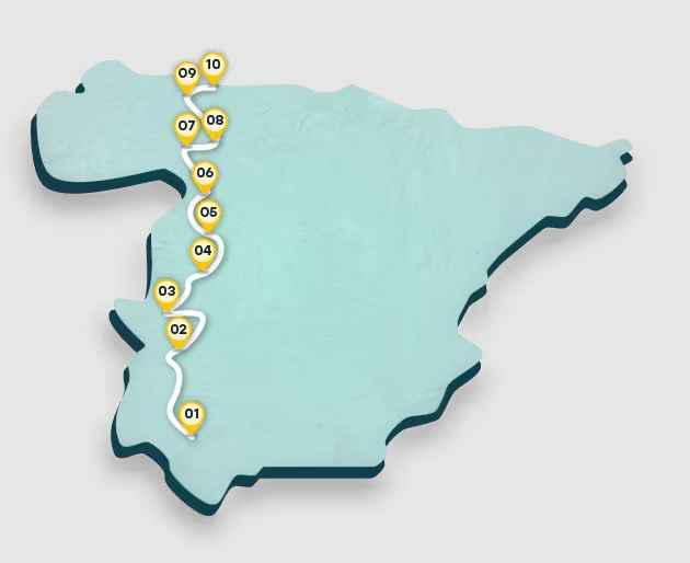The route begins in the southern city of Seville (Andalusia) and heads north toward the Bay of Biscay. The journey crosses six provinces, passing through monumental hubs like Mérida, Salamanca, and León, before reaching its terminus in the coastal city of Gijón (Asturias).