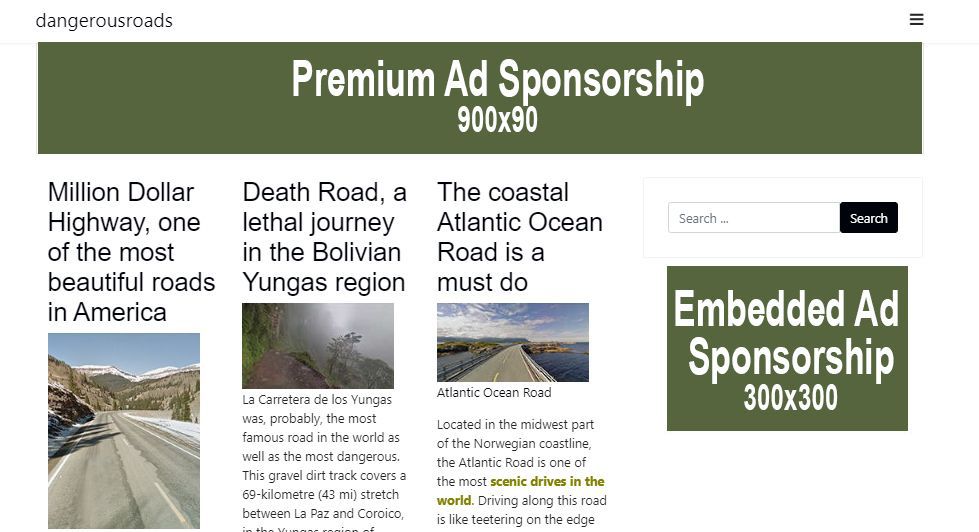 Note: We DO NOT inflate our page views by making people click many pages to read the content. We also DO NOT buy cheap traffic to jack up our prices. This is why we have flat pricing. Rates are net and subject to change. Option to renew will be at then-effective rates. Dangerousroads.org reserves the right to refuse campaigns/creative it deems inappropriate.