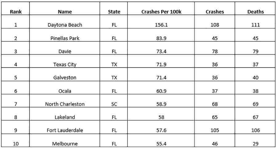 Florida and California dominate the list of high-risk zones due to their high registration numbers and year-round riding weather. Events like Daytona Beach Bike Week significantly spike the per-capita crash rate, which can reach nearly double the national average in these specific hotspots.