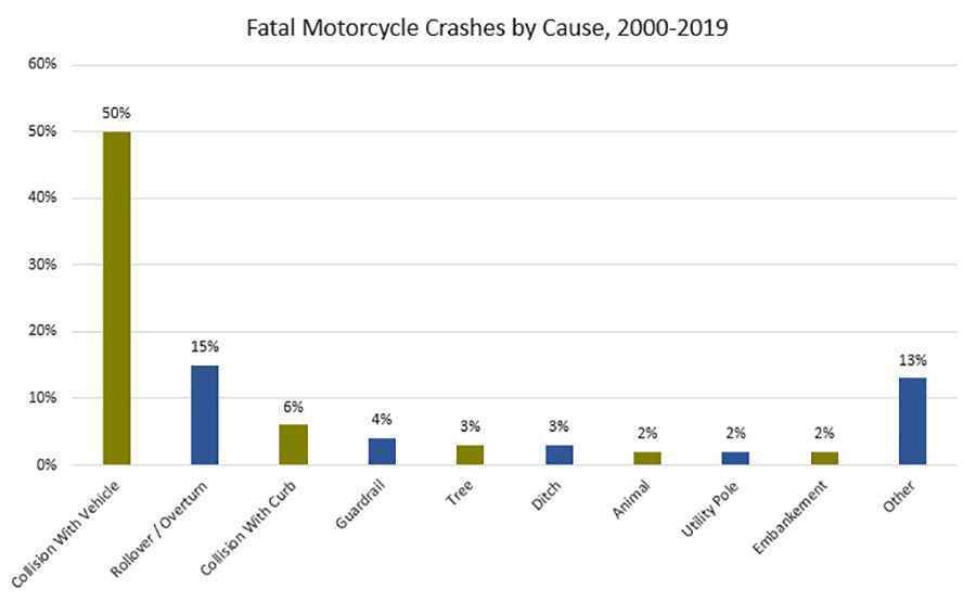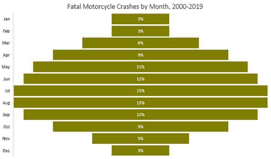 An overwhelming 61% of fatal crashes occur between May and September. Contrary to popular belief, most lethal incidents happen during daytime hours and in clear weather, coinciding with peak recreational riding periods. Visibility and high rider volume during summer months are the primary factors behind these figures.