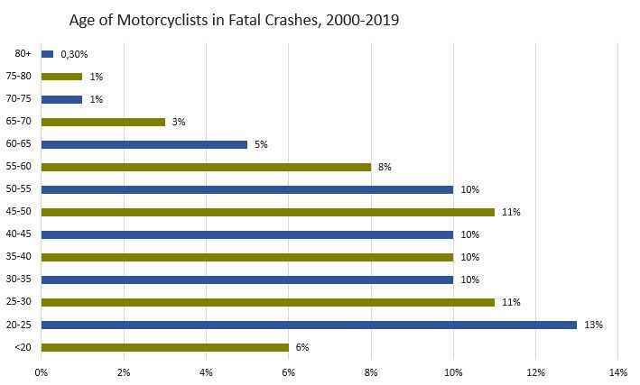 While the 20-25 age range remains highly vulnerable, there has been a significant 33% increase in fatalities among riders aged 40-60. Statistically, 96% of riders killed in accidents are male. This shift is often attributed to older riders returning to motorcycling with high-displacement bikes without recent training.