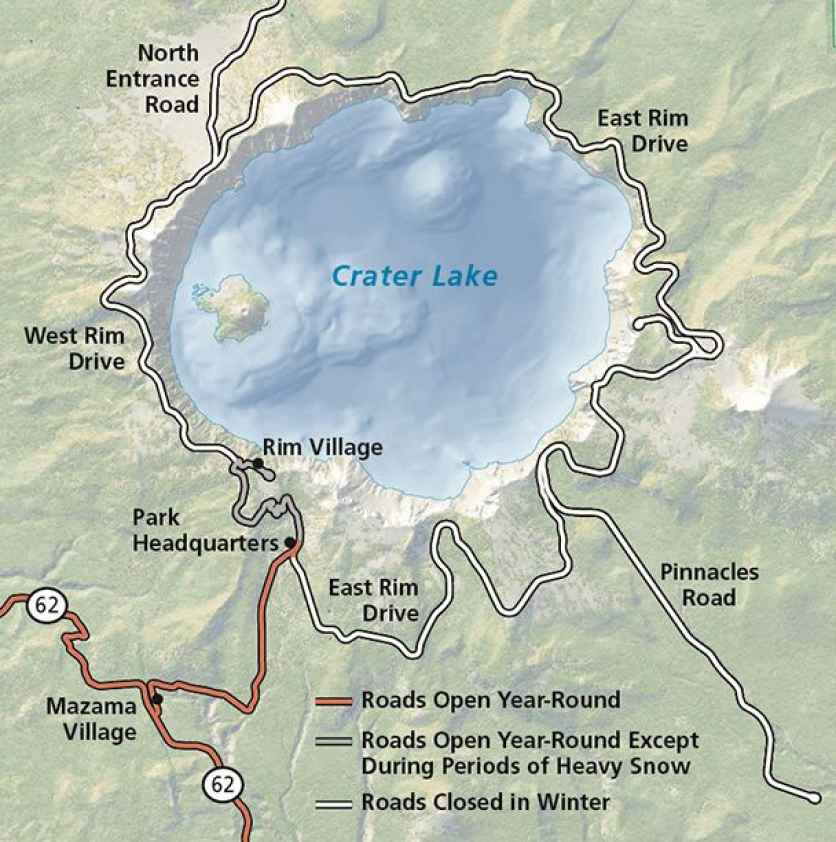 Check for road conditions and closures when planning your visit. Rim Drive is only open during the summer due to heavy snowfall, typically from July through October. Conditions can change quickly and be harsh. As there is a lot of snow in the winter, Rim Drive is often closed until June and not normally cleared until late May or early June. In most places, the road is covered by more than 20 feet (6.1 m) of snow with drifts as deep as 60 feet (18 m) in some areas.